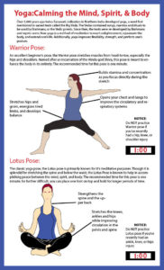During this class, I experimented with all these to begin understanding the world of graphic design work. One of our assignments was based around creating an infographic. The key was to select a topic and transform it – what topic can be shown using graphs rather than simply explaining steps? What is better with illustrations? So, using Adobe Illustrator and Adobe InDesign, I created my “Yoga: Calming the Mind, Spirit, & Body” informational graphic sheet. It was very interesting, and quite a bit of fun to work with these products.